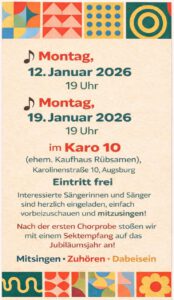 Die Proben sind als offenes musikalisches Miteinander angelegt: gemeinsames Einsingen, gemeinsames Arbeiten an Stücken, gemeinsames Erleben von Klang und Chorgemein-schaft. Wer mitsingen möchte, ist ebenso willkommen wie alle, die zunächst zuhören möchten. Im Anschluss an die erste Probe stoßen wir gemeinsam auf den Beginn des Jubiläumsjahres an.
